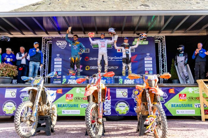 Un départ canon d’Axel Destarac qui arrache le 24MX holeshot à Antonin Mille, tous deux partis très fort pour cette course de 3H ! Antonin aura les commandes de la course un tour et demi avant de se faire reprendre par Hugo Blanjouequi va imprimer, comme à son habitude, un gros rythme ! Dans son sillage, Charlier déroule, venant chatouiller le champion en titre sans jamais arriver à le devancer. Avec le jeu des ravitaillements et les stratégies qui vont avec, Enrico Rinaldi prendra la tête pour plusieurs tours suivi par Le Quéré. Mais quasiment aussitôt, Blanjoue a repri la tête pour la conserver et s’imposer avec 53 secondes d’avance sur Charlier et une 1 minute et 24 secondes sur Le Quéré qui complète le podium. Au Scratch Deux Temps, Loic Larrieu, victime de quelques soucis mécaniques, s’est tout de même imposé dans cette catégorie. Antonin Mille finira cinquième de la course mais remportera le prix PublimanMX qui récompense le pilote le plus rapide en piste ! Chez les Juniors, Diego Foucher auteur d’un très bon départ à mené sa catégorie de bout en bout, ne souffrant d’aucun défaut. Matteo Arrieta, vainqueur en Corse doit se contenter de la deuxième place à près de 4 minutes du leader du jour. Clément Daussat Daure complète le podium de cette catégorie Junior. Chez les Nationaux 1, Haddad Killian s’impose devant Debou Alexis et Vincent Benjamin. En catégorie Nationaux 2, Saves Joffrey l’emporte devant Dufour Alexandre et Maxence Seguin. Les Nationaux 3, menés par Renouleau Maxime, Mazet Maxime et Delpech Benjamin. Chez les Vétérans, Bernard Mathieu s’impose en Bronze, Fretigne David en Or et Taesch Jerome en Argent. Chez les Duos, c’est l’équipage Hellouin/Weiss qui s’impose devant Levallois/Boulland et Martinez/Mazur !